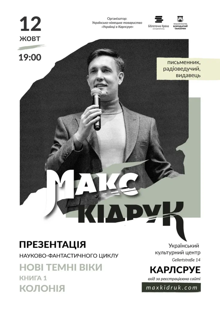 Український письменник, популяризатор науки та видавець Макс Кідрук відвідає Карлсруе у рамках європейського туру на підтримку роману «Колонія» — першої книги науково-фантастичного циклу «Нові Темні Віки».