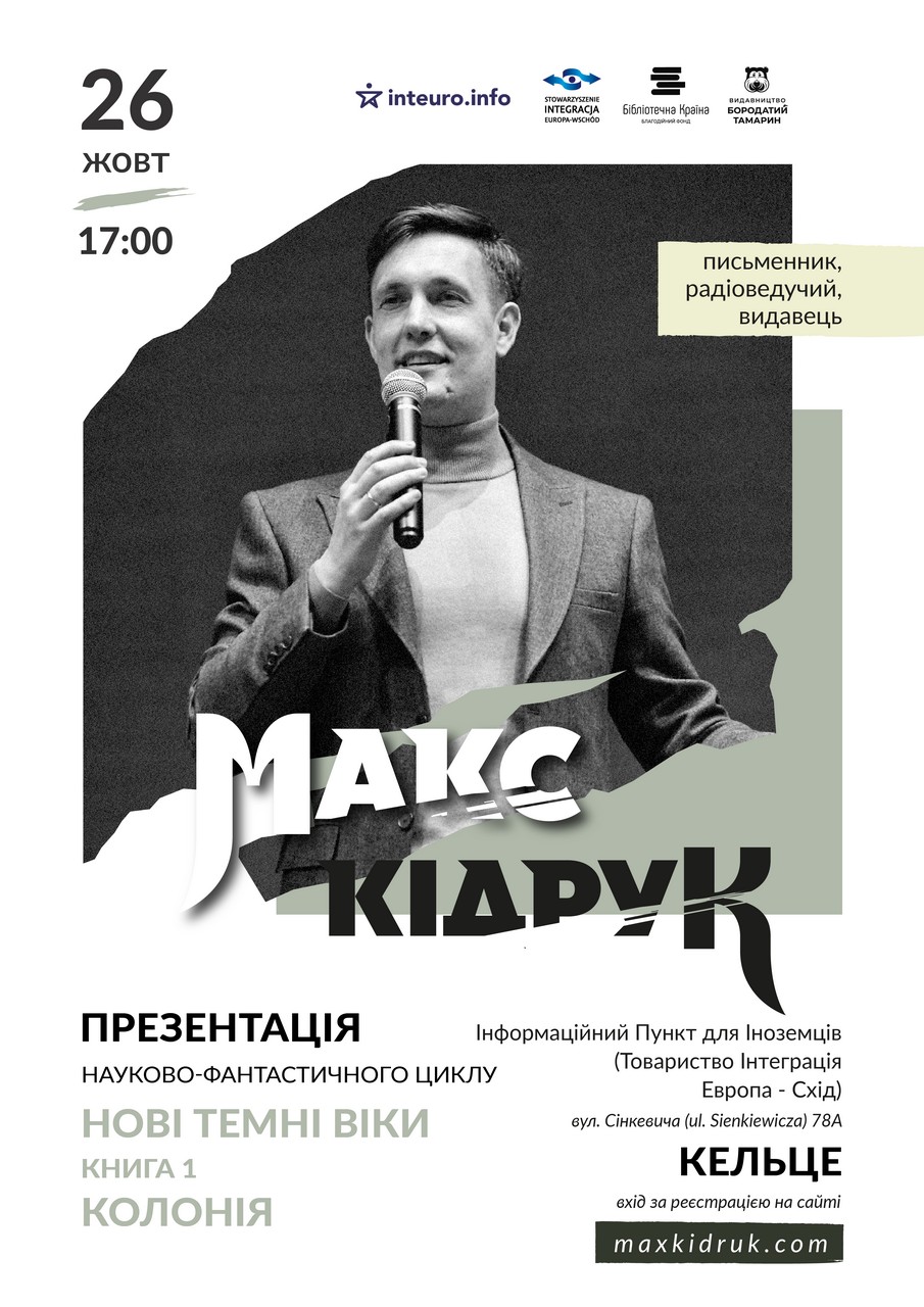 Український письменник, популяризатор науки та видавець Макс Кідрук відвідає Кельце у рамках європейського туру на підтримку роману «Колонія» — першої книги науково-фантастичного циклу «Нові Темні Віки».