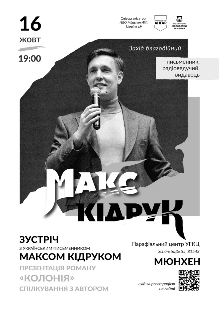 Окрім того, Макс Кідрук презентує нонфікшн книги видавництва «Бородатий Тамарин» та історію про те, як запустити в Україні видавництво під час повномасштабного вторгнення. Після презентації можна буде придбати роман «Колонія» та інші книги видавництва, отримати автограф, сфотографуватися. Мова заходу – українська.