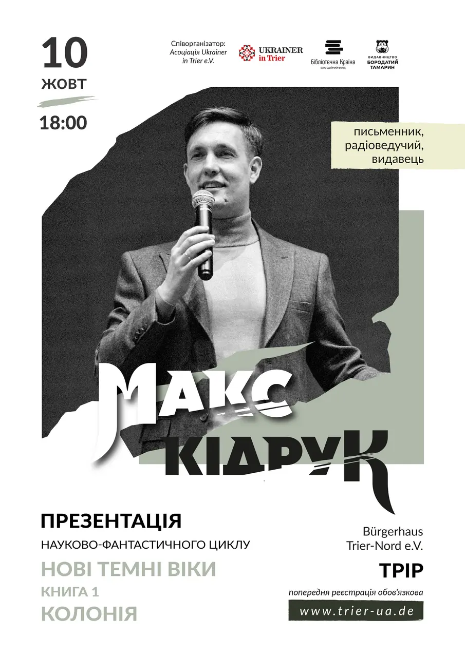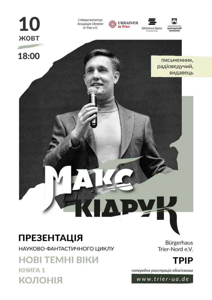 Український письменник, популяризатор науки та видавець Макс Кідрук відвідає Трір у рамках європейського туру на підтримку роману «Колонія» — першої книги науково-фантастичного циклу «Нові Темні Віки».